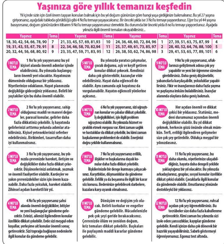 Yıl içinde sizin için özel önem taşıyan konuları bulmak için bu yıl doğum gününüze göre hangi yaşa girdiğinize bakmalısınız. Bu yıl 27 yaşına giriyorsanız, aşağıdaki tabloda görüldüğü gibi 4 No’lu temayı yaşayacaksınız. Bir önceki yılda ise 3 No’lu temayı yaşıyordunuz. Eğer bu yıl 44 yaşına basıyorsanız, doğum gününüzden itibaren 9 No’lu temayı yaşıyorsunuz demektir. Bu durumda bir önceki yılda 8 no’lu temayı yaşıyordunuz. Aşağıda yılınızla ilgili önemli temaları okuyabilirsiniz…