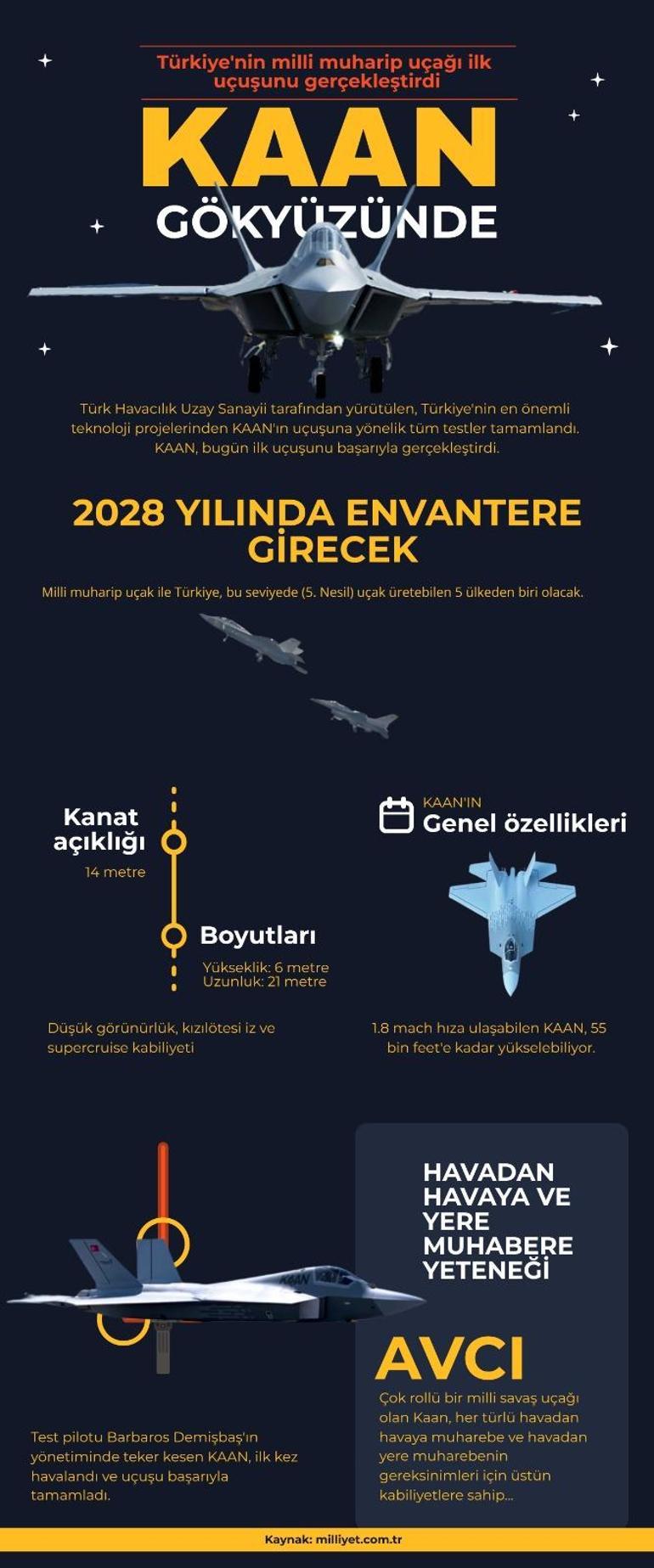 Oğuzcan Atış / Milliyet.com.tr – Sabah saatlerinde Türk Havacılık Uzay Sanayii (TUSAŞ) tesislerinde gerçekleştirilen uçuşla ilk yerli ve milli savaş uçağının test sürecinde kritik bir aşama geçilmiş oldu ve KAAN’ın uçuş testleri resmi olarak başladı. İlk uçuşunda bir F-16 ile birlikte havalanan KAAN, test pilotu Barbaros Demirbaş’ın idaresinde sorunsuz bir uçuşun ardından başarılı şekilde iniş gerçekleştirdi.