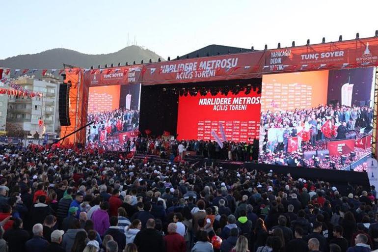 Narlıdere Metrosu açılış töreninde konuşan ve yeni dönemde aday gösterilmeyen İzmir Büyükşehir Belediye Başkanı Tunç Soyer, “5 yıl önce, seçim beyannamemizde, 165 projemizi gerçekleştirmeyi vadetmiştim. Bu projeleri yüzde 87’lik bir oranda tamamlamış üzerine bir de 15 proje eklemiş ve bu oranı gerçekleştirmiş tek belediye başkanı olmaktan büyük gurur duyuyorum. 5 yılda İzmir’in 50 yıllık kangren olmuş sorunlarını çözdük ve gelecek 50 yılını teminat altına aldık. Cumhuriyetimizin 100. yılını, tarihe nakşettiğimiz 9 Eylül kutlamaları ve İkinci Yüzyılın İktisat Kongresiyle taçlandırdık. Uluslararası alanda sahip olduğumuz itibar ve İzmir duruşuyla, 5 yılda uluslararası finans kuruluşlarından en fazla finansman getiren belediye olduk. Ya bir yol bulduk ya da bir yol açtık. Daima; çok renk, daima çok ses, daima çok nefesle hep öncü olduk” dedi.