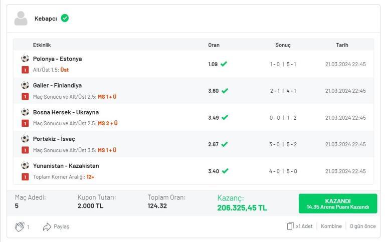 Kuponunun son karşılaşması olarak da Yunanistan – Kazakistan karşılaşmasına “Toplam Korner 12 ve Üst” oynayan üyenin şansına karşılaşmada tam 13 korner oldu. Bu tercihiyle de 3.40 gibi oldukça yüksek bir oran tutturan üye böylece 5 maçta 124.32 oran tutturarak 206 bin 325 TL kazanmış oldu ve bu kuponuyla Misli Arena’da günün “En İyi 20” kuponu arasında yer aldı.